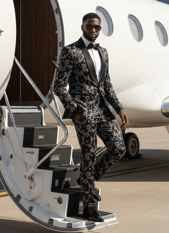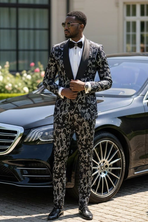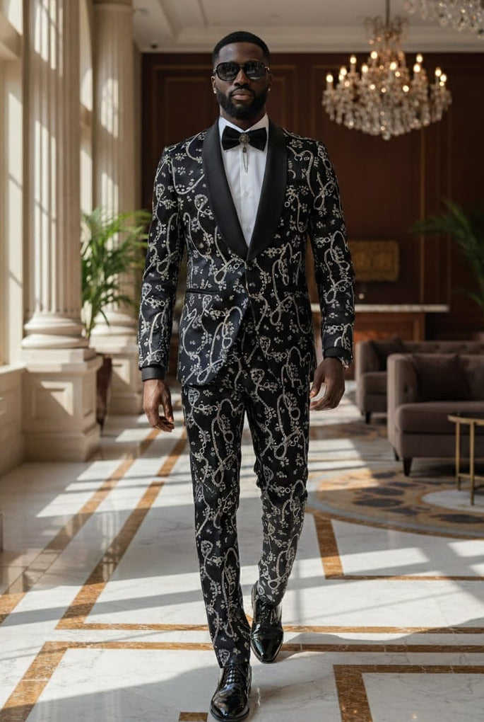 EFFETTI BY Giovanni Testi 2 Piece Slim Fit Suit ,Floral-Chain Design, Black Satin Shawl Lapel, 1 Button, Center Vent. Matching Pants ( not in picture)