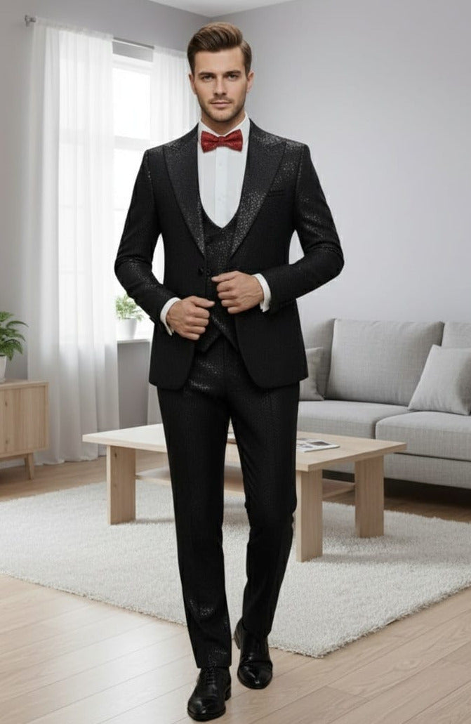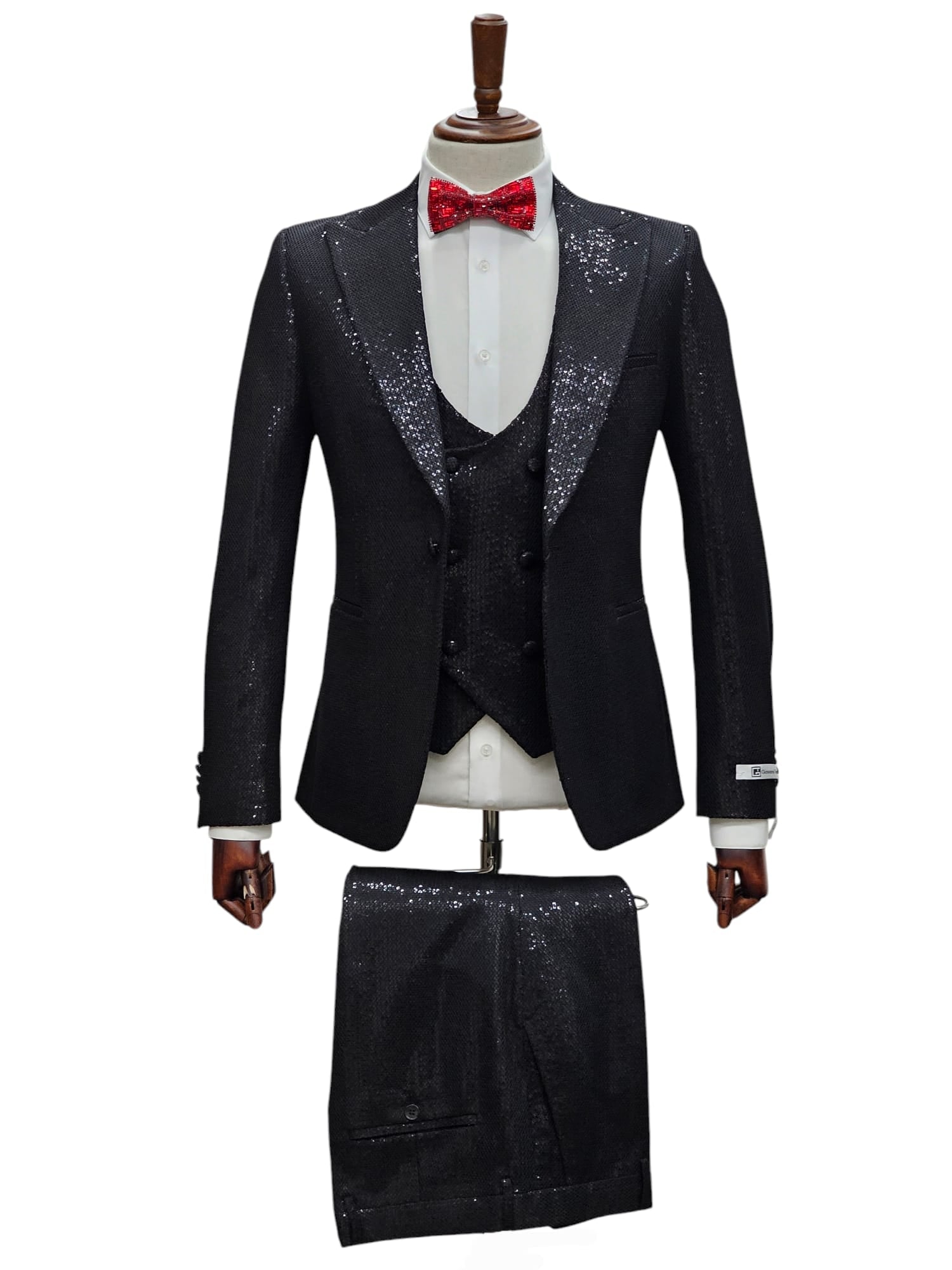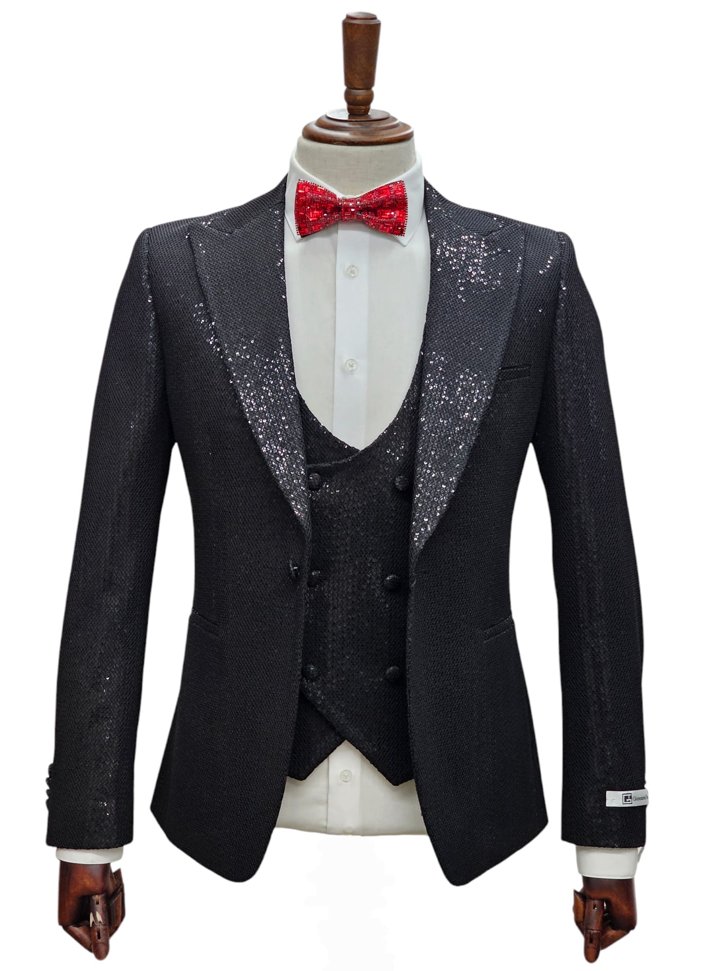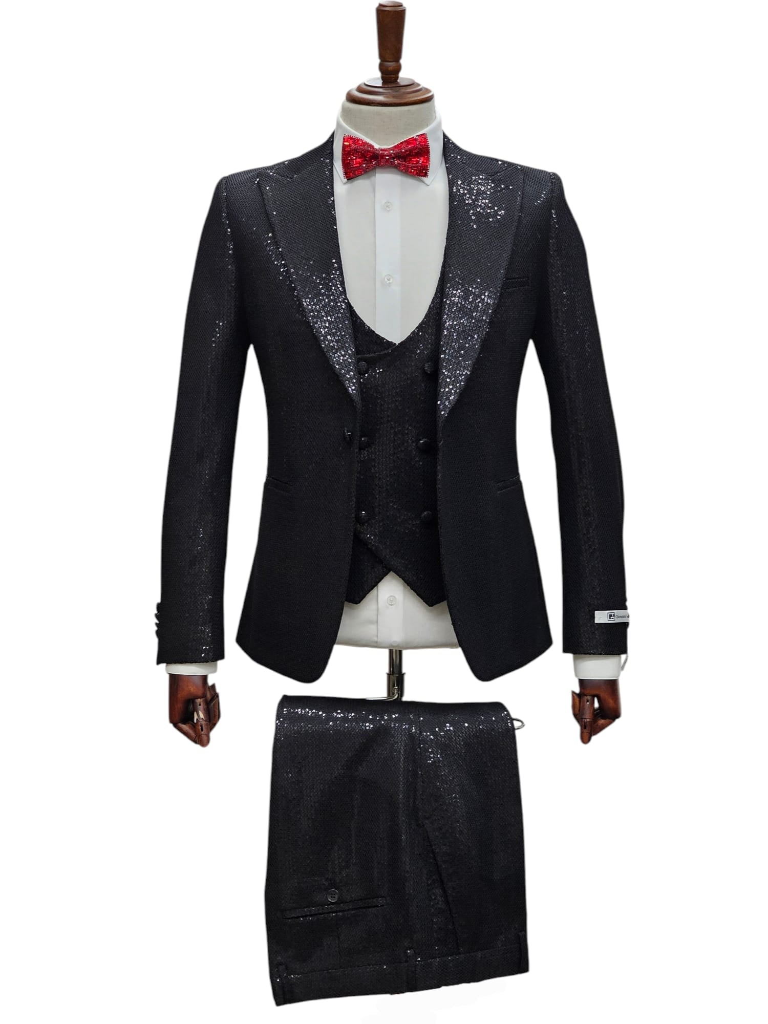 Giovanni Testi 3 Piece Slim Fit Black Sequins Suit, Double Breast Vest, Peak Lapel, Side Vents with Matching Pants.
