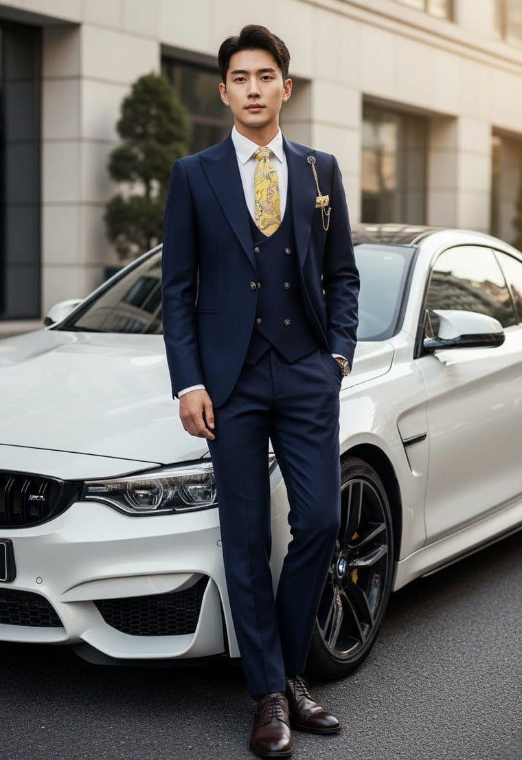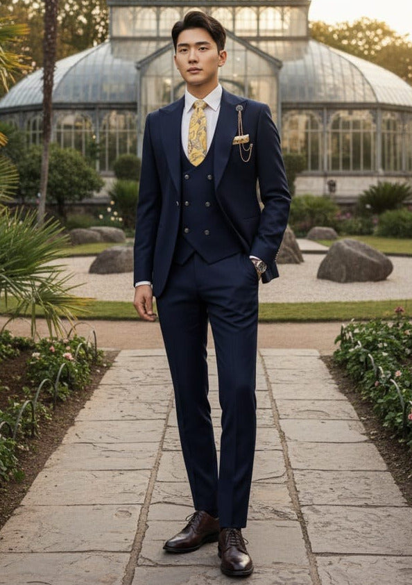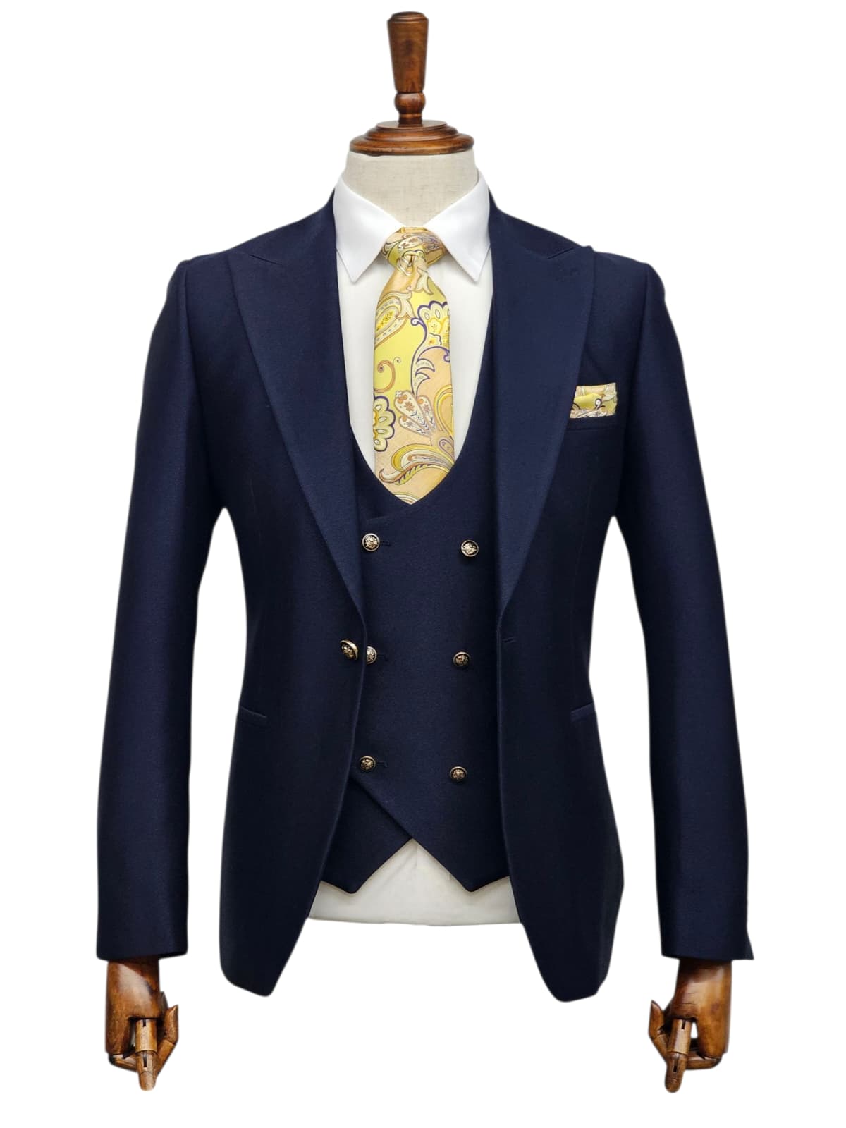GIOVANNI TESTI SLIM FIT 3 Piece Suit, 1 Button, Peak Lapel, Center Vent. Double Breasted Vest.