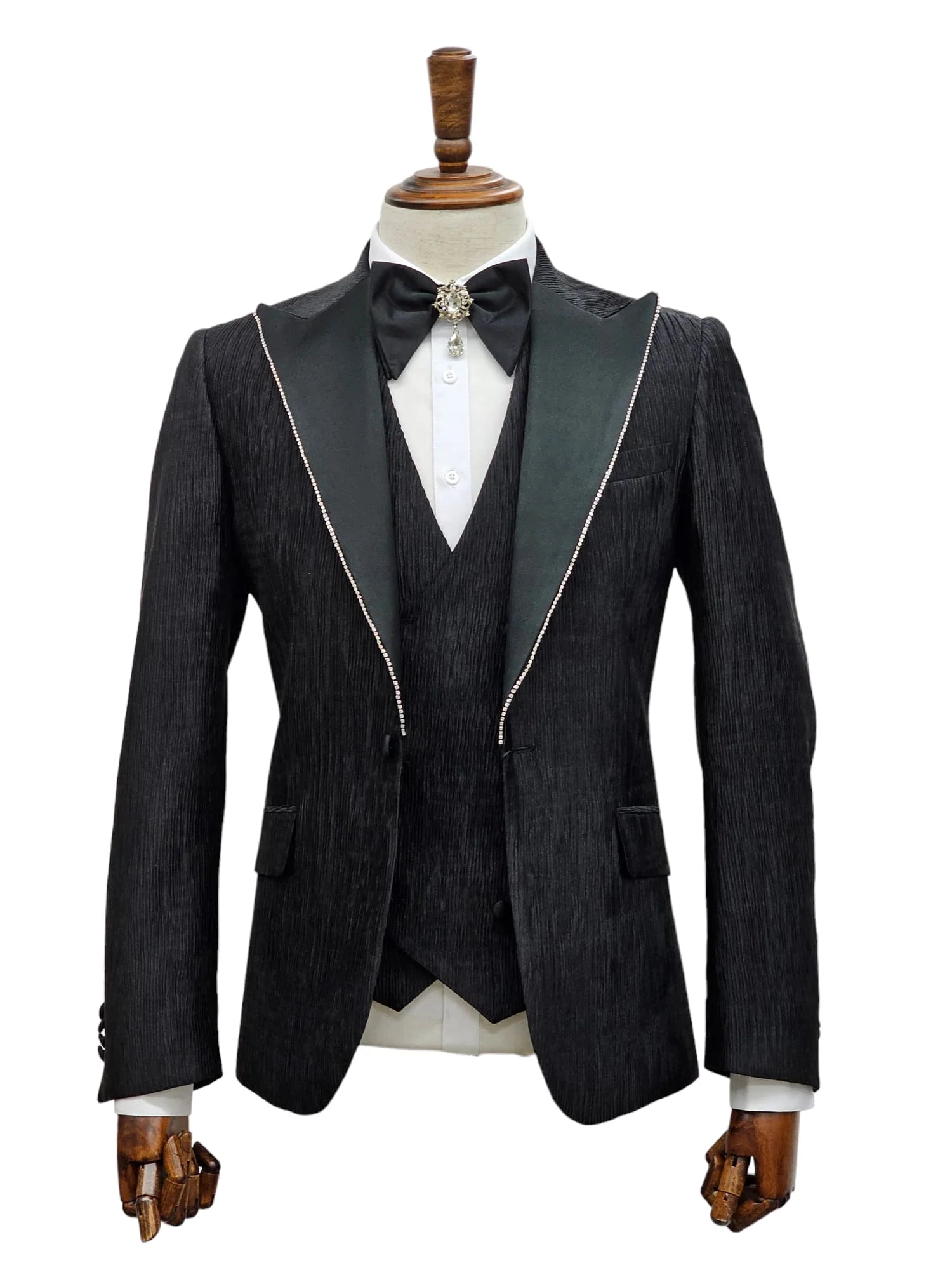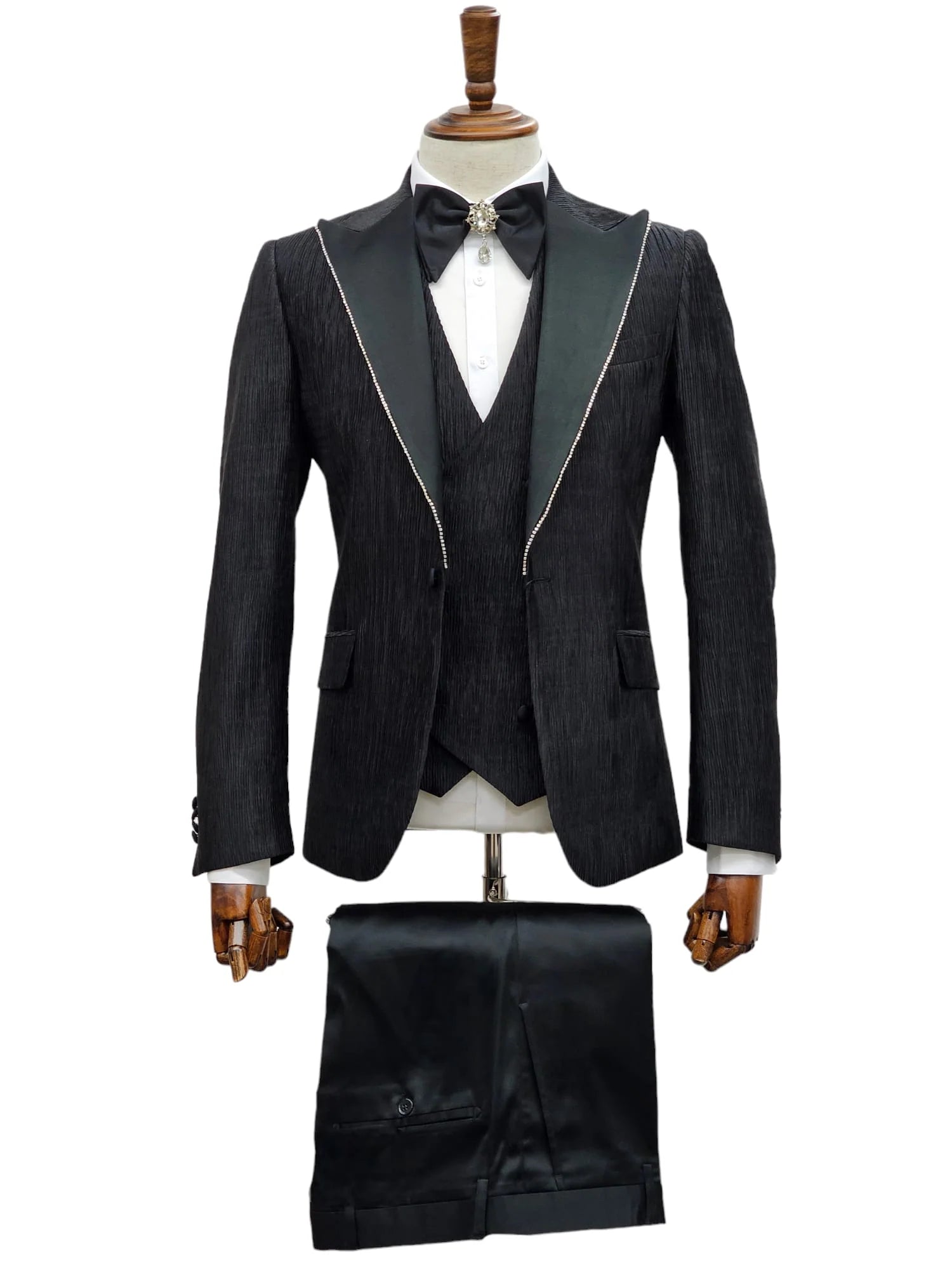 3 Piece Slim Fit Suit, Pleated Fabric, Satin Peak Lapel with Jewel Trim, 1 Button, Center Vent, matching satin pants.
