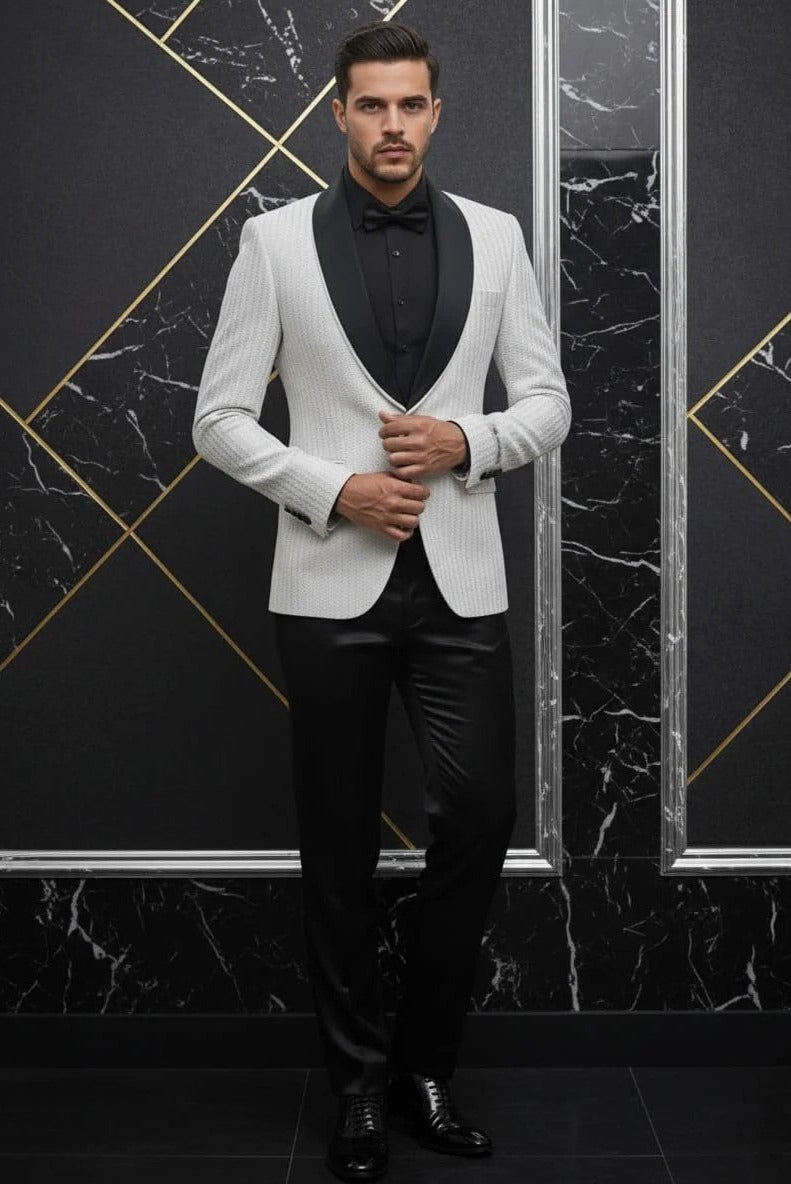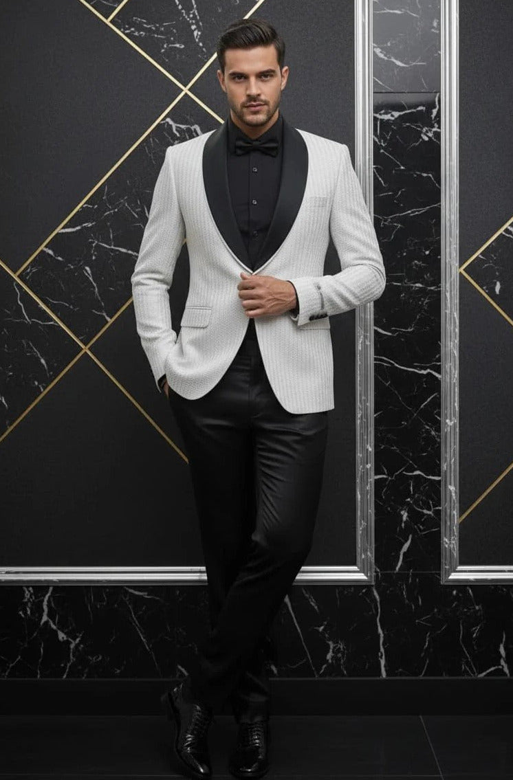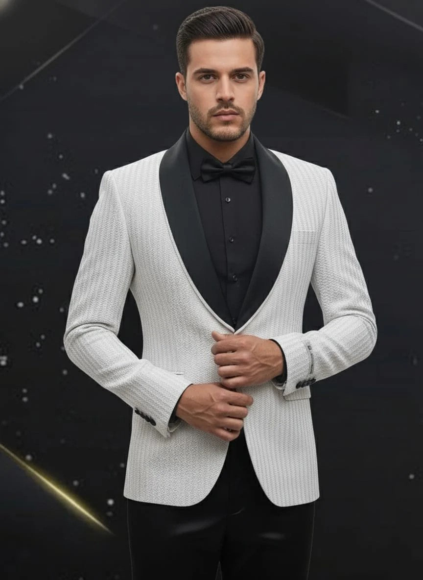 2 Piece Slim Fit Suit, White - Silver Chevron pattern fabric, Black Satin Shawl Lapel with White Bead Trim, 1 Button, Center Vent with Black Satin Pants.