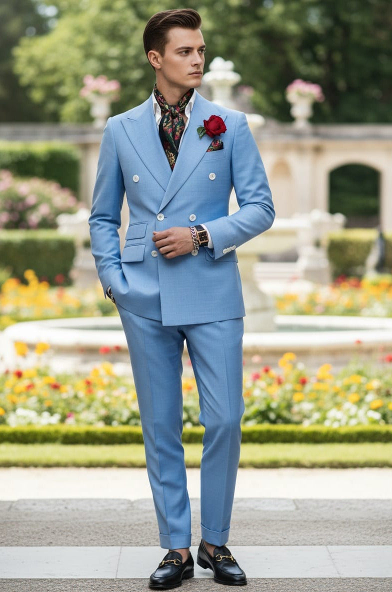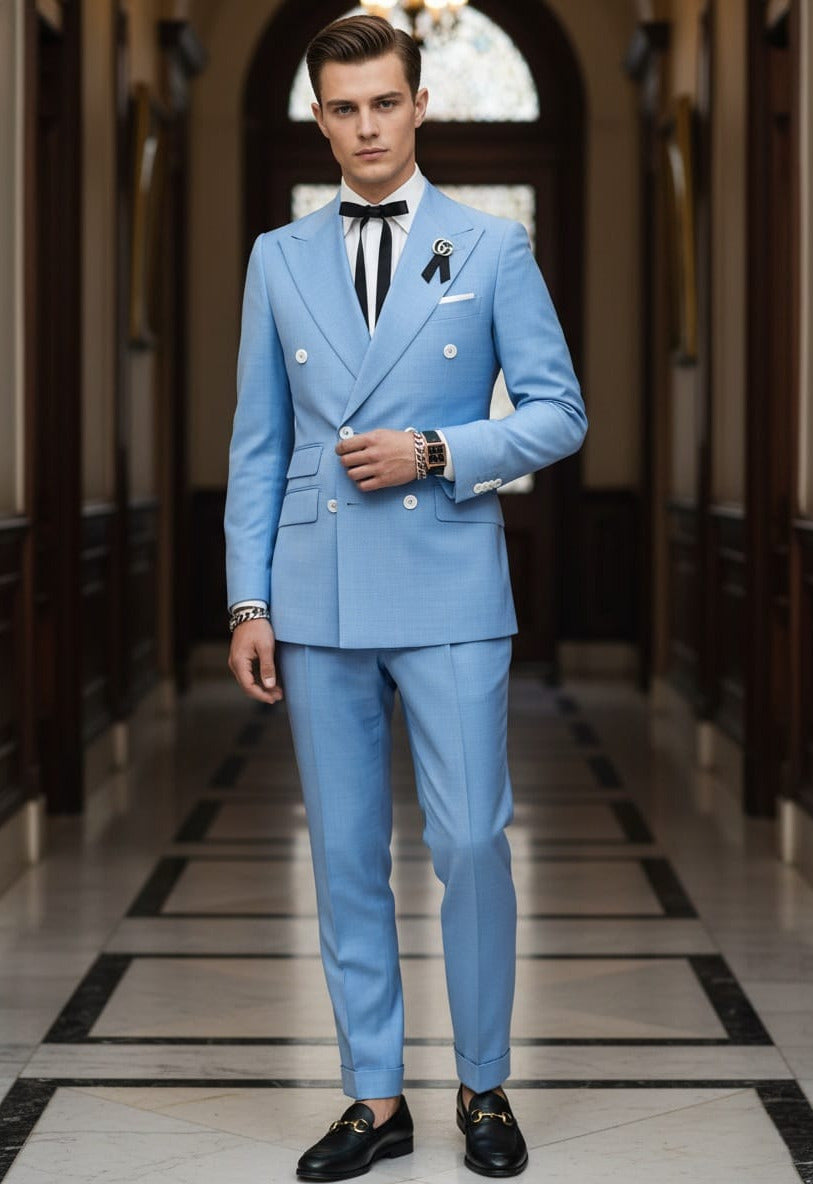 GIOVANNI TESTI , Slim Fit, 2 Piece Double Breast Suit with 6 Buttons. Peak Lapel and Center Vent.