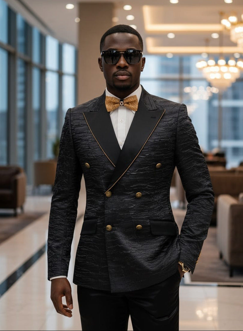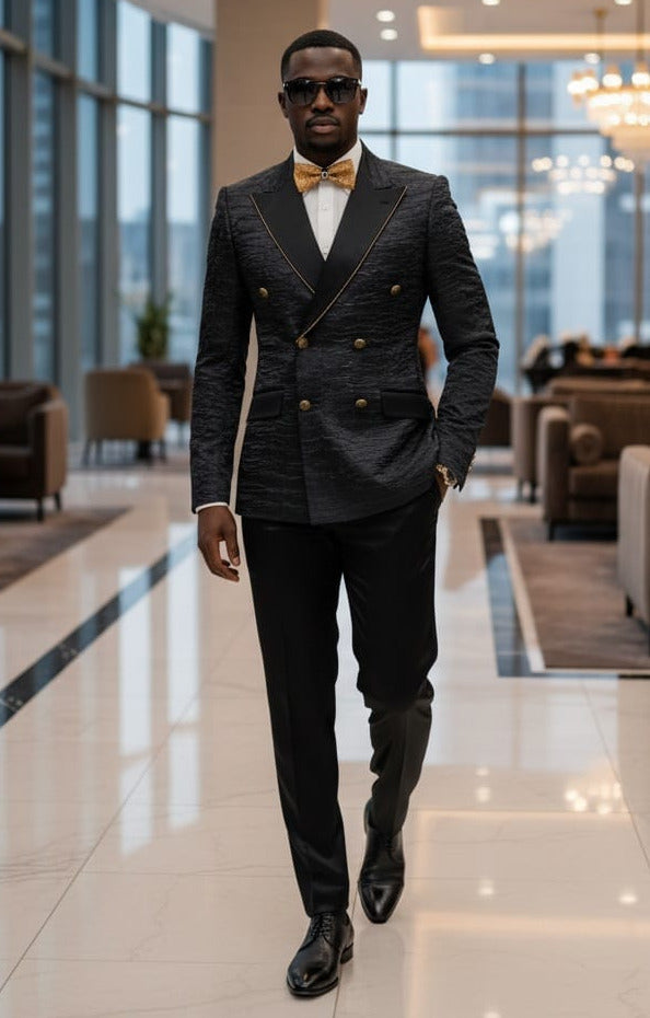 2 Piece Double Breast Slim Fit Suit, Black Bronze Crinkle fabric, Black Satin Peak Lapel with Jewel Trim, 6 Button with Center Vent. Black Satin Pants.