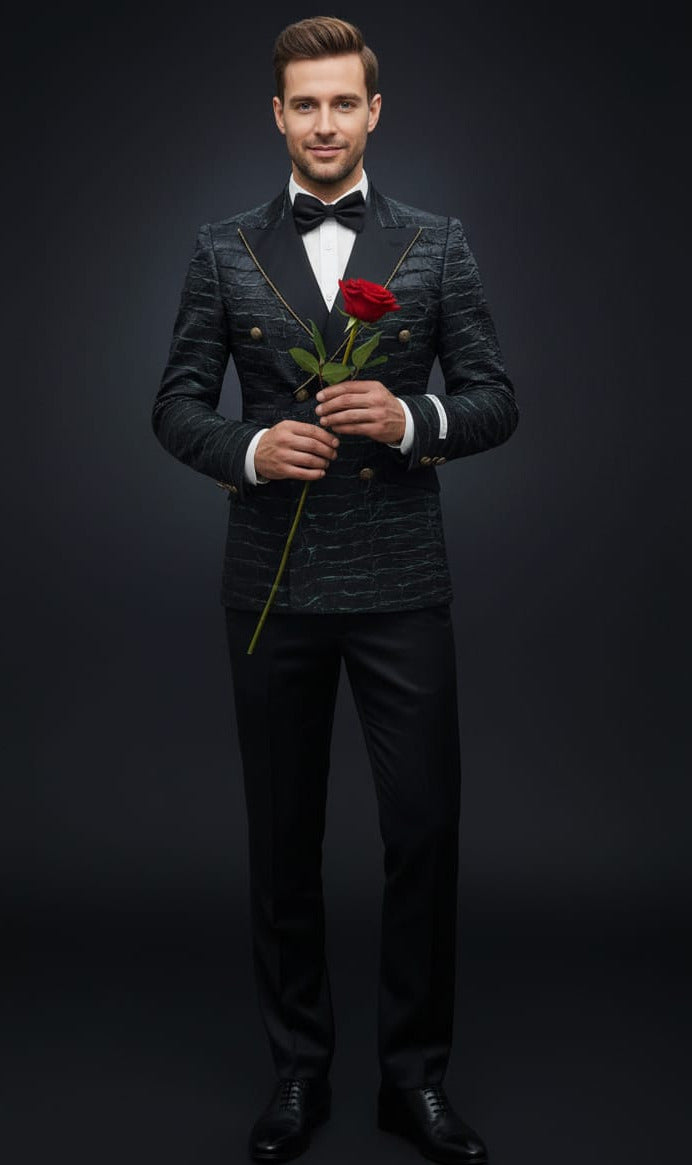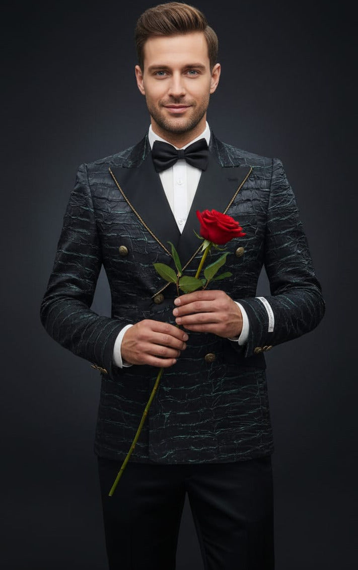 2 Piece Double Breast Slim Fit Suit, Black Green Crinkle fabric, Black Satin Peak Lapel with Jewel Trim, 6 Button with Center Vent. Black Satin Pants.
