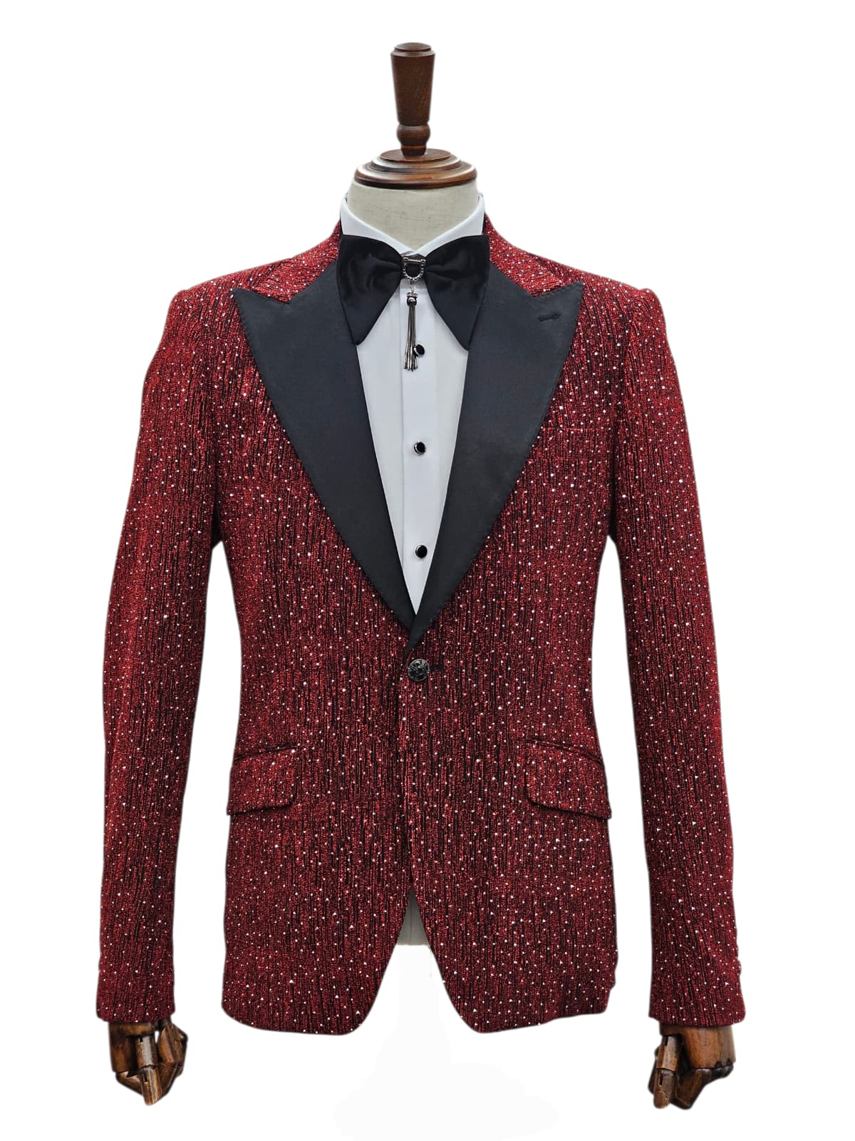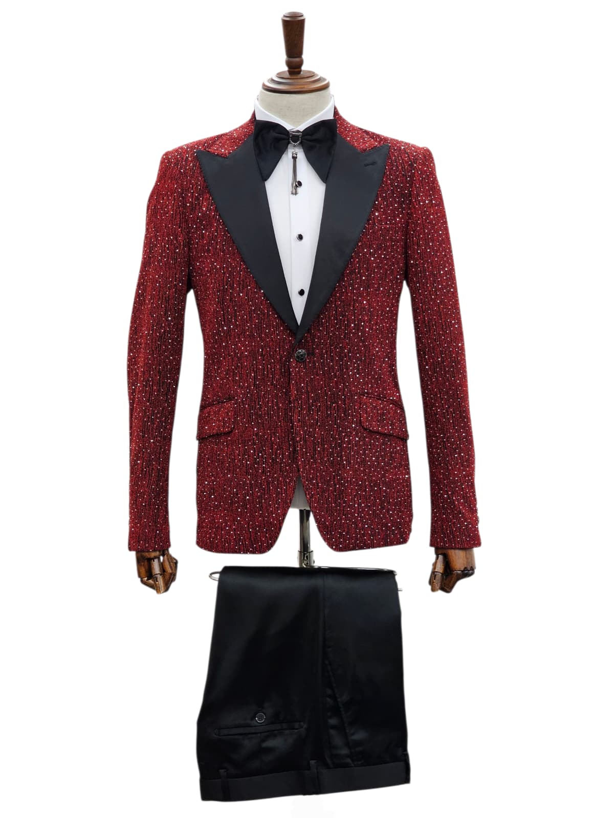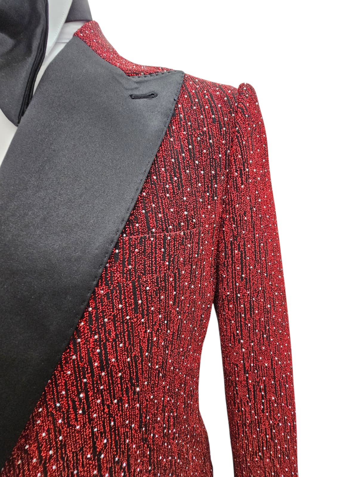 Giovanni Testi Slim Fit Jacket, Jewel Studded Textured Fabric, 1 Button, Black Satin Peak Lapel.