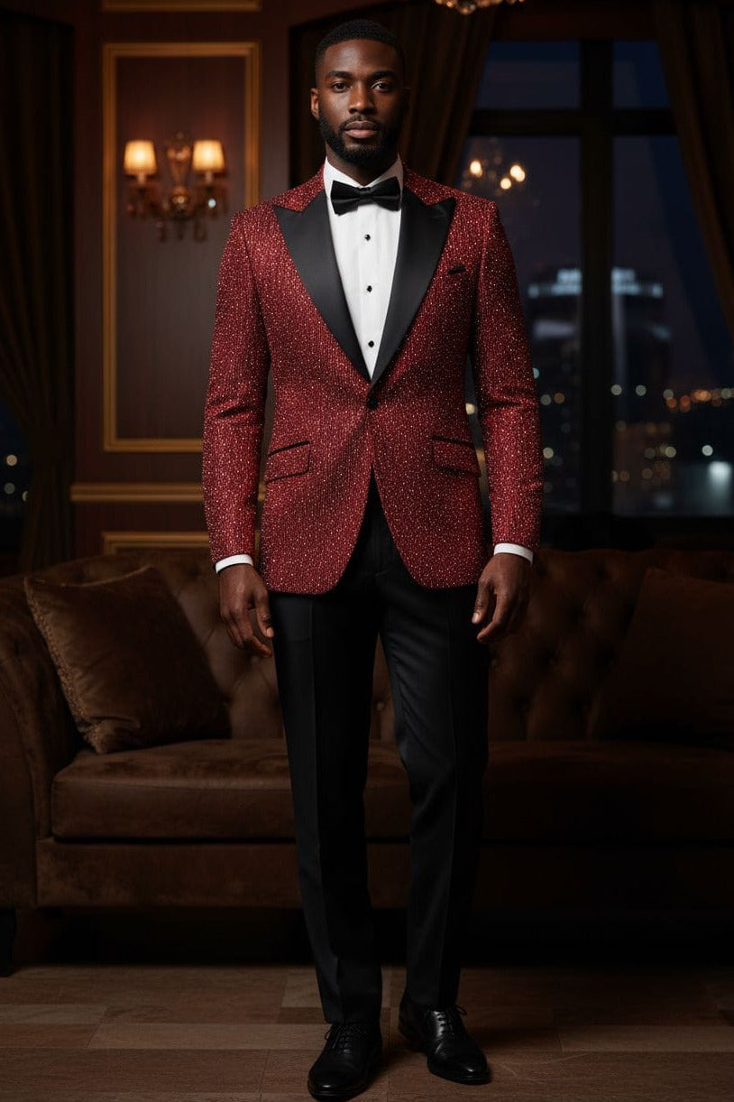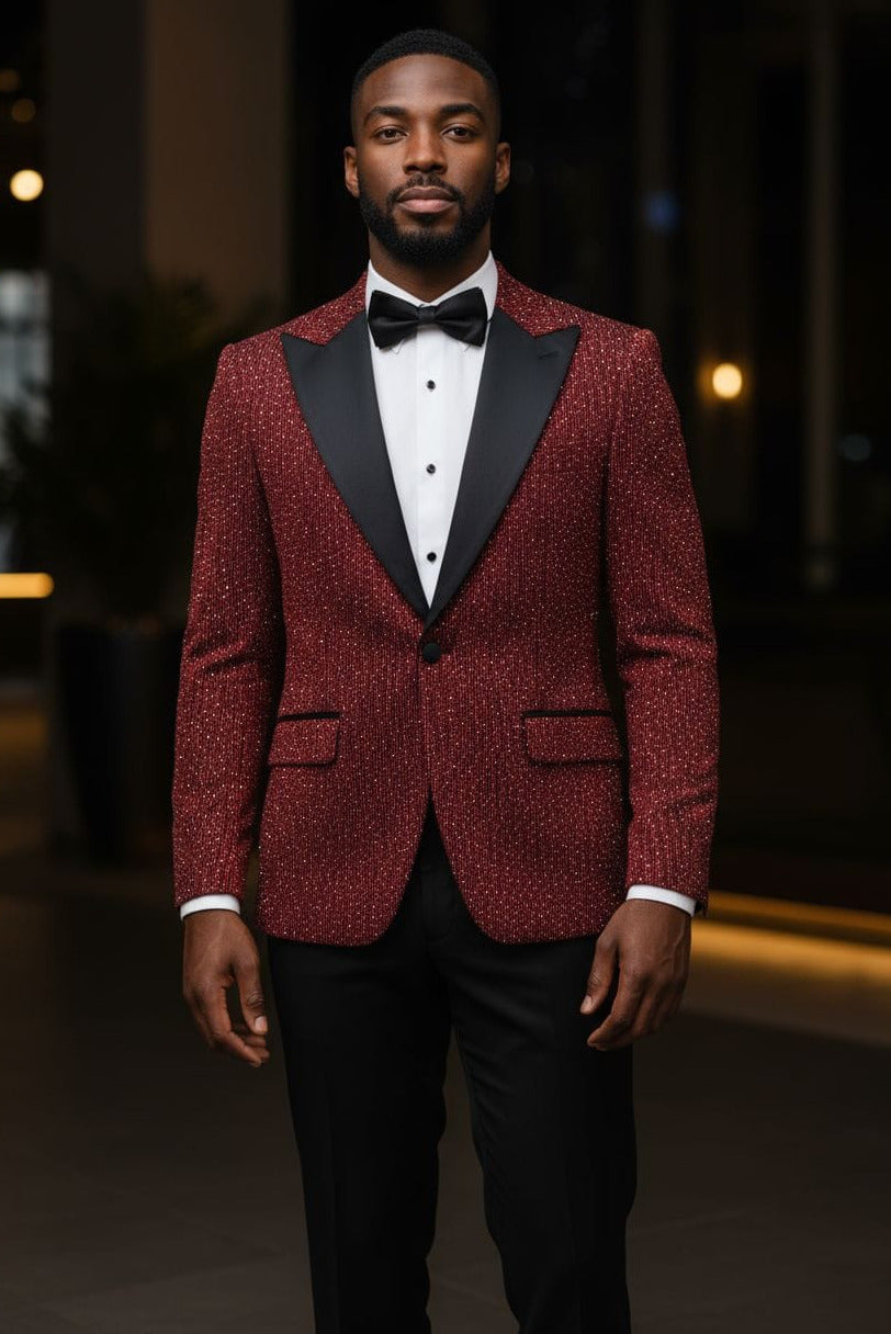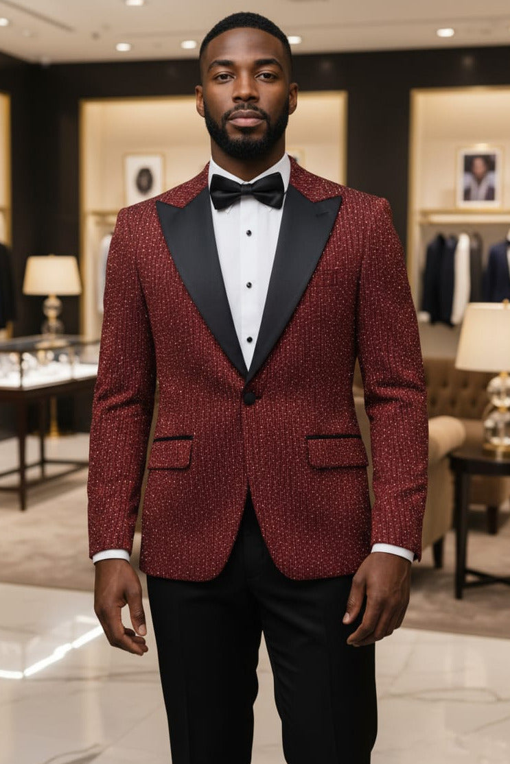 Giovanni Testi Slim Fit Jacket, Jewel Studded Textured Fabric, 1 Button, Black Satin Peak Lapel.