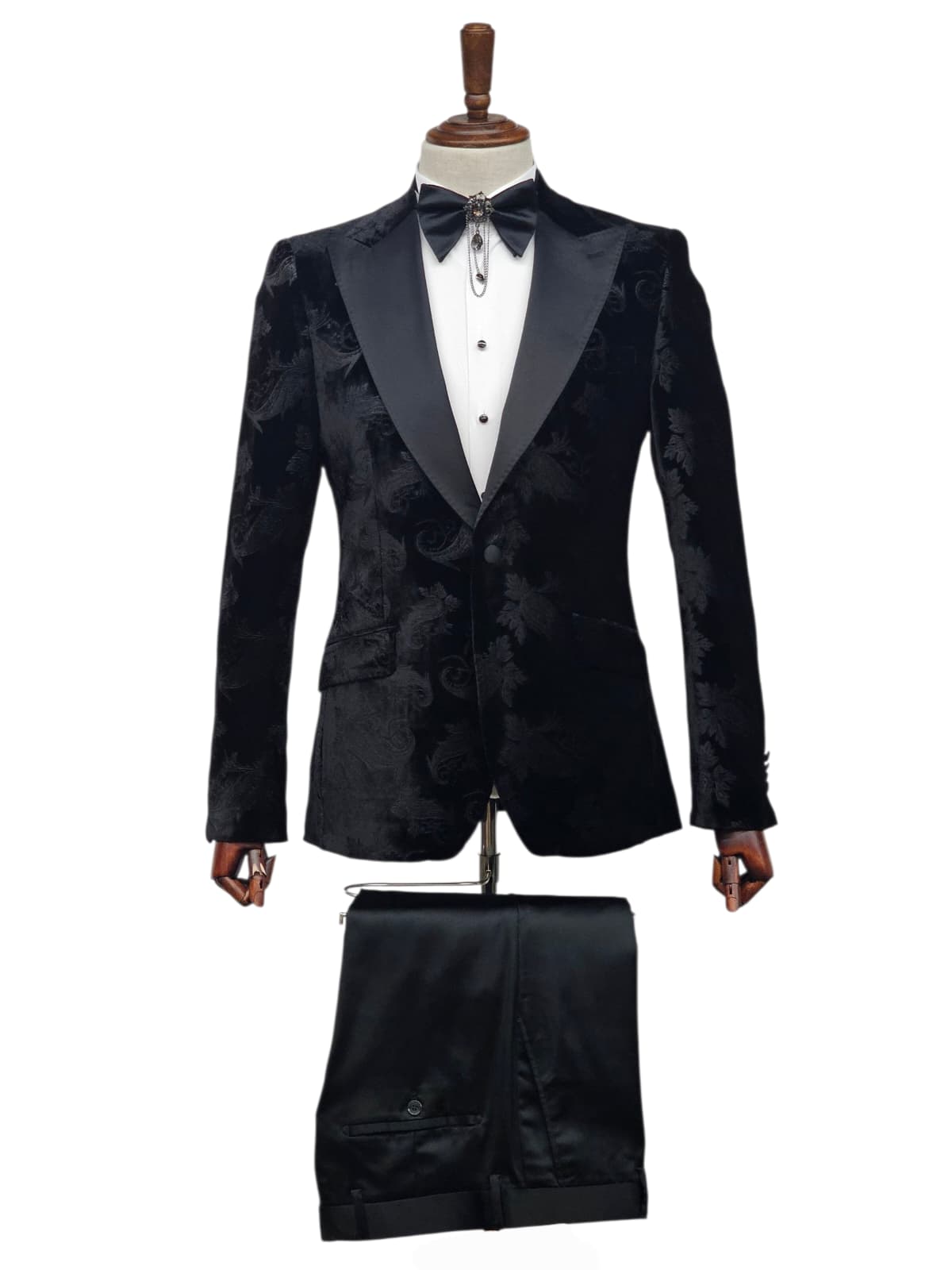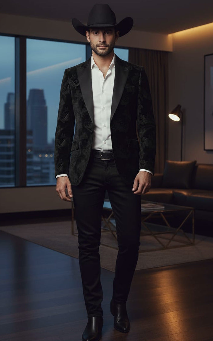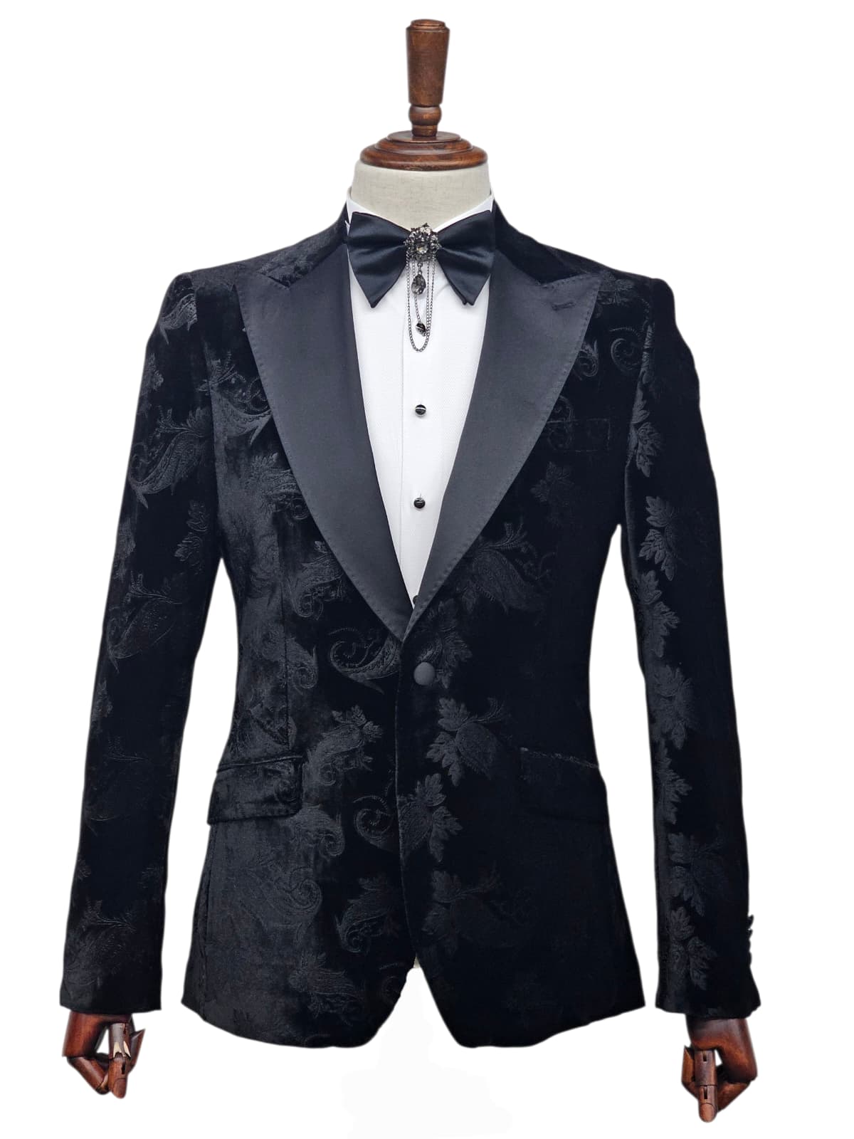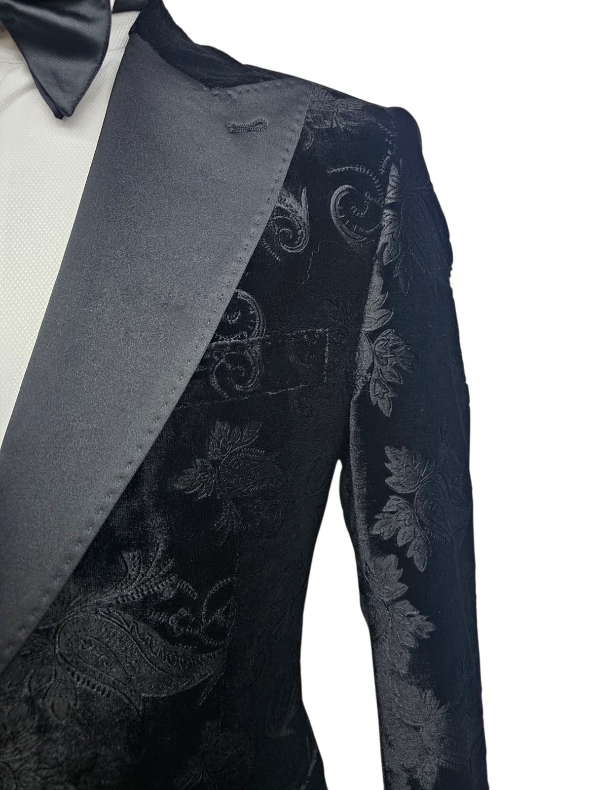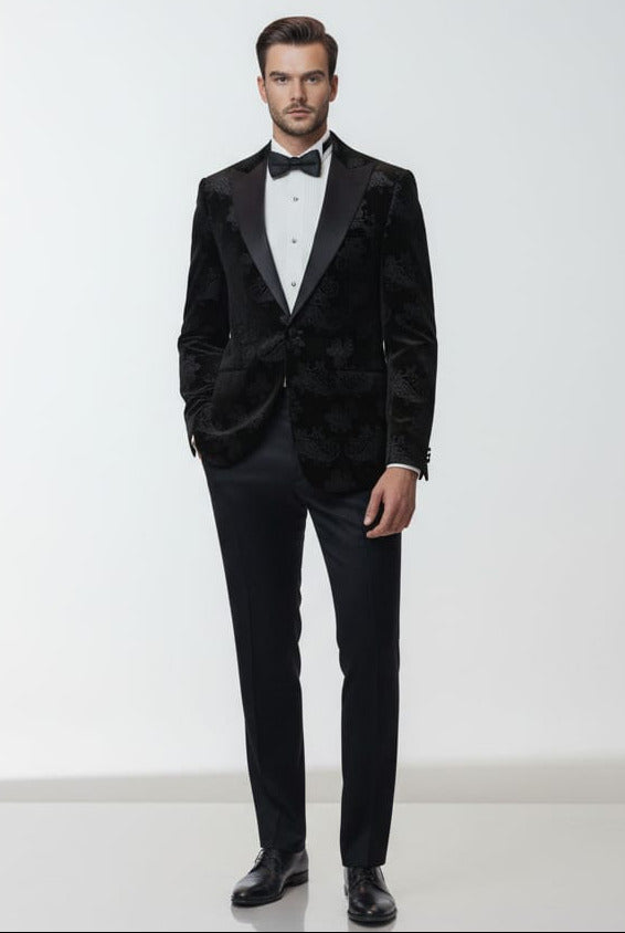 Giovanni Testi Slim Fit Velvet Jacket only, Paisley Pattern, 1 Button, Satin Peak Lapel, Pocket Flaps and side vents.