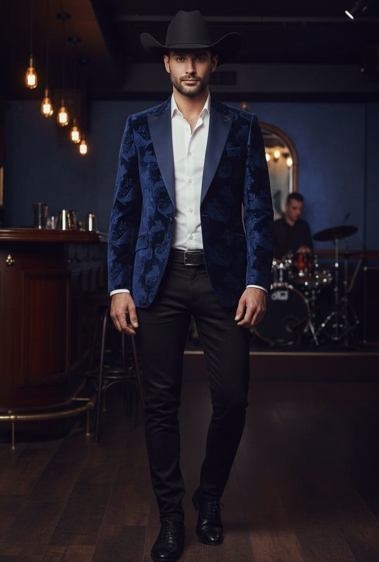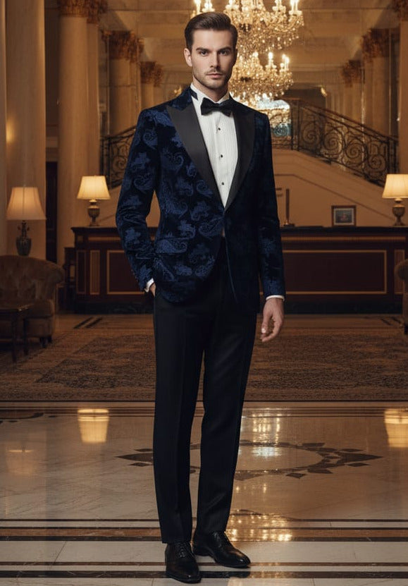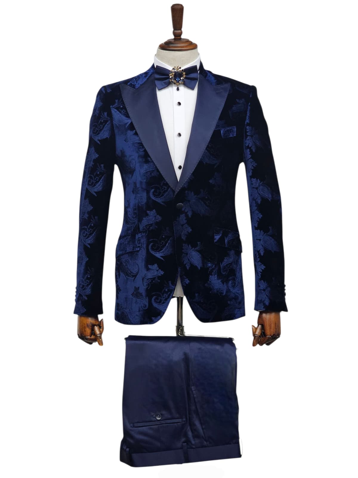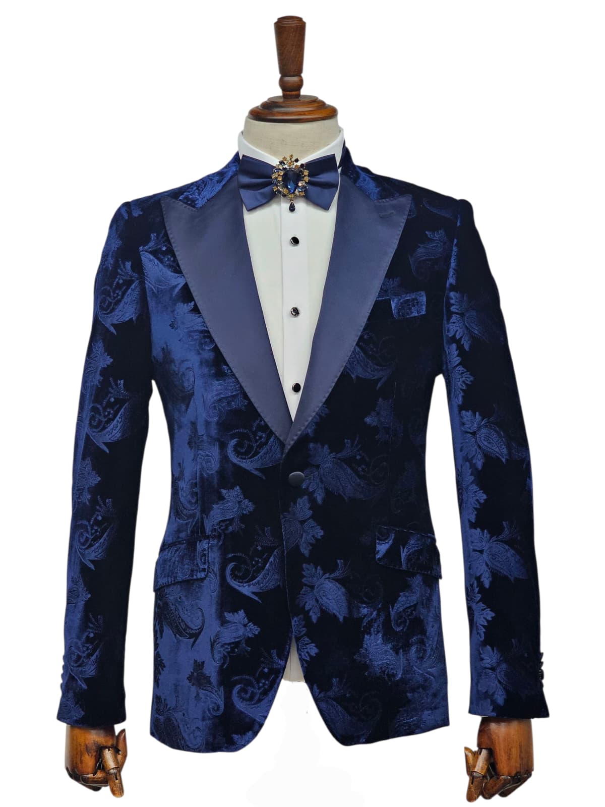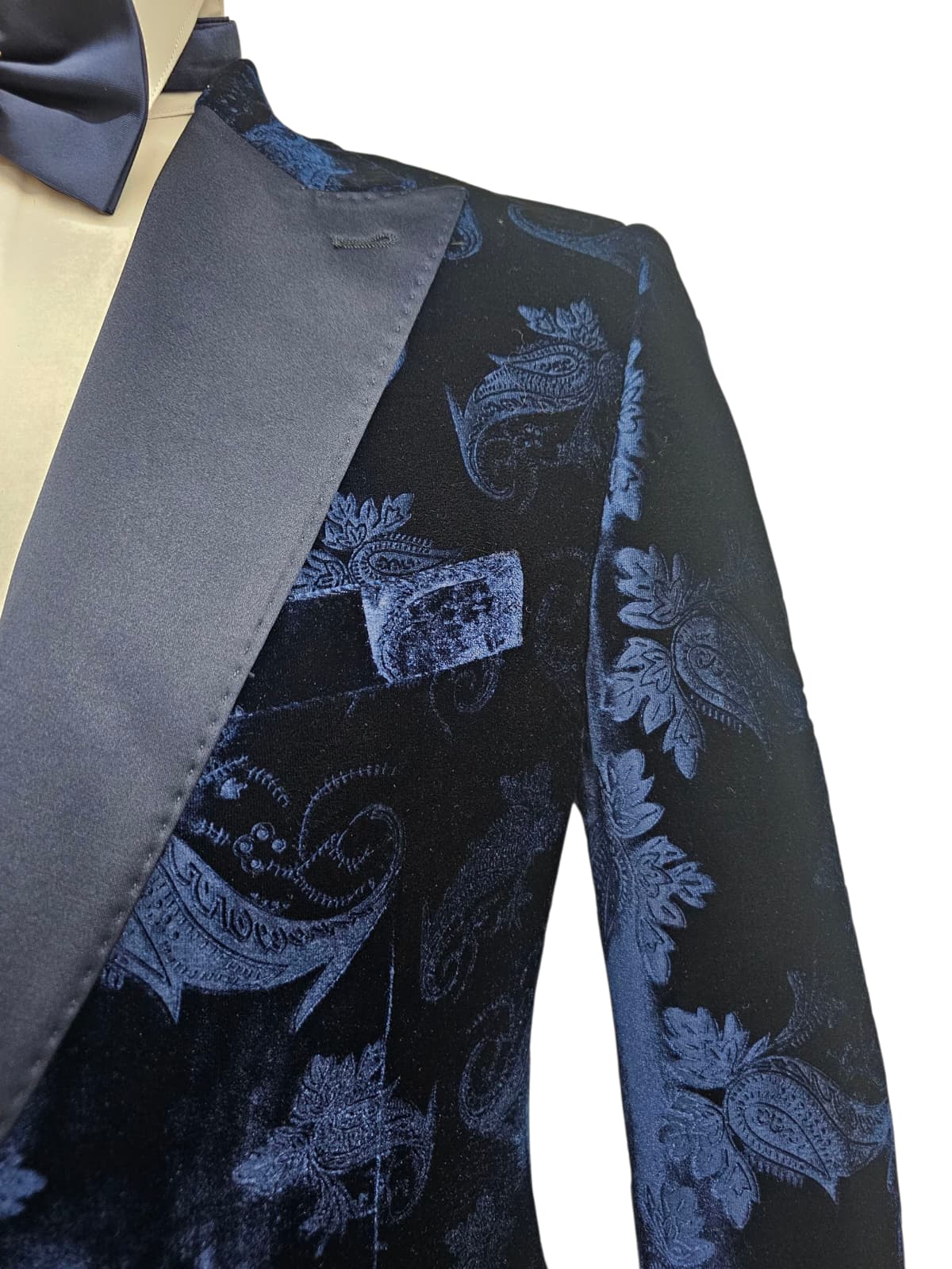 Giovanni Testi Slim Fit Velvet Jacket only, Paisley Pattern, 1 Button, Satin Peak Lapel, Pocket Flaps and side vents.